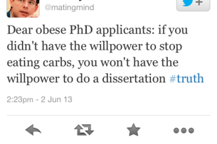 Professor sets off furor with comment on Twitter about obese Ph.D. applicants.